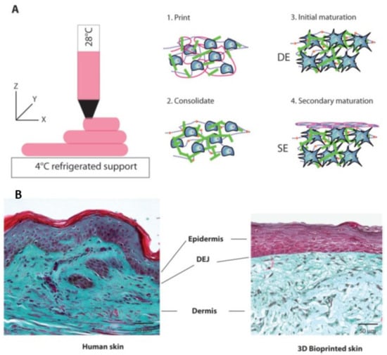 Tissue engineering has become an important research area in the past two decades since it allows restoration of the functionality of damaged tissues and organs [1]. The skin is the outer covering and the largest organ of the human body. Skin tissue engineering and regeneration has been favourable for making important advances in wound healing by designing constructs with similar structures and biological functions of native tissues [2]. With the advent of 3D printing technology, much effort has been invested to transform conventional approaches and develop new 3D bioprinting techniques that can produce more complex, functional, and personalised three-dimensional architectures with better imitation behaviour [3,4]. In this context, it is important to analyse the different types of 3D printing technologies and their associated printing parameters [5,6,7].