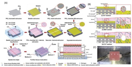 - Gao, C.; Lu, C.; Jian, Z.; Zhang, T.; Chen, Z.; Zhu, Q.; Tai, Z.; Liu, Y. 3D Bioprinting for Fabricating Artificial Skin Tissue. Colloids Surf. B Biointerfaces 2021, 208, 112041. [Google Scholar] [CrossRef]
