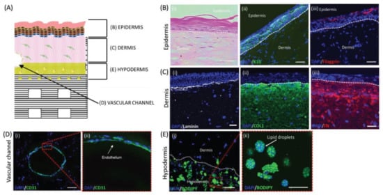 - Kim, B.S.; Gao, G.; Kim, J.Y.; Cho, D.-W. 3D Cell Printing of Perfusable Vascularized Human Skin Equivalent Composed of Epidermis, Dermis, and Hypodermis for Better Structural Recapitulation of Native Skin. Adv. Healthc. Mater. 2019, 8, 1801019. [Google Scholar] [CrossRef]