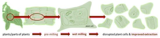 PlantCrystals are composed of plants and/or parts of plants and possess sizes <1 µm. They are produced in a similar way to drug nanocrystals, which are typically produced by bead milling or high pressure homogenization [1,2,3,4]. Therefore, the name “PlantCrystals” is a combination of the words “plants” and “nanocrystals”, i.e., it combines the source and the production method of the PlantCrystals. Wet milling enables an efficient destruction of plant cells, which typically possess sizes >10 µm. The destruction of the plant cells and organelles allows for a fast and exhaustive extraction of plant constituents without the need of organic solvents (Figure 1). Thus, the PlantCrystal-technology is considered to be a novel, environmentally friendly plant extraction process; the suitability of the technology over classical extraction methods was already proven in various recent studies [1,4,5,6,7,8,9,10,11,12]. These studies could, for example, show an enhanced extraction efficacy, especially for lipophilic compounds when compared to classical extraction methods and could also demonstrate an improved therapeutic efficacy when compared to classical extracts. The reason is the efficient destruction of the plant material during bead milling and/or high-pressure homogenization (HPH). HPH has been used for >100 years for the destruction of particles and is well known to cause cell rupture [13]. Recently, HPH was also shown to enable the formation of exosomes from a human glioblastoma cell line [14].