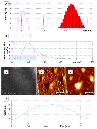 The samples were diluted (1:1000) with filtered (0.22 µm) PBS and were pipetted onto a silicon wafer (1 × 1 cm2). After 20 min of incubation, the suspension was removed by aspirating the extra water, leaving the tested samples on the silica wafer. AFM was then performed on a NanoWizard 3 NanoScience AFM (JPK Instruments, Berlin, Germany). The microscope was vibration-damped. Commercial 1-levertips (NSC 14 Al/BS) on a cantilever with a length of 125 µm and a resonance frequency of about 140 kHz and a force constant of 5 N/m were applied. Measurements were performed in tapping mode in the air. The scan speed was adjusted between 0.5 and 1.5 Hz [40].