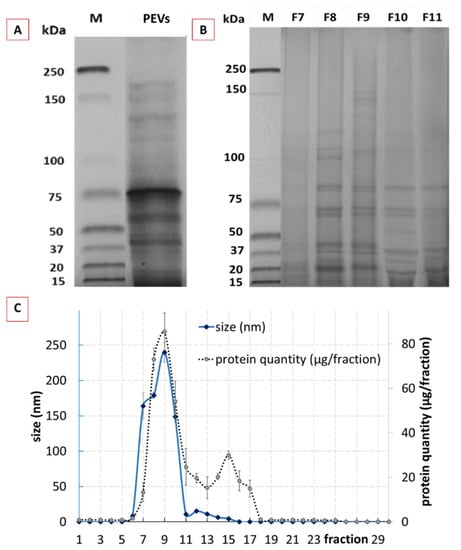 Purification of the crude classical PEVs resulted in 30 fractions with different sizes, protein content and profile (Figure 3B,C). The size profile of the fractionated crude PEVs showed one peak with sizes >100 nm in between the fractions 7–10 (Figure 3C—blue line), indicating that these fractions contained the cucumber-derived PEVs [24]. The total protein yield after purification was 76% and the protein elution profile resulted in two broad peaks (Figure 3C—dotted line). The first peak corresponded to the PEVs size fraction (F8–F10) and the second peak was found within the fractions F11–F18. The bimodal protein elution profile obtained is in line with a study published for tomato juice and, therefore, indicates that the first peak corresponds to the PEVs (F8–F10), whereas the second peak is derived from soluble proteins, which were late eluted as they were entrapped in the pores of the used beads [24]. The elution profile also shows that most of the proteins are entrapped in the PEVs and that only minor proportions of the protein were not entrapped within the PEVs. Hence, as already shown in previous studies, SEC proved to be an efficient method for the purification of PEVs.
