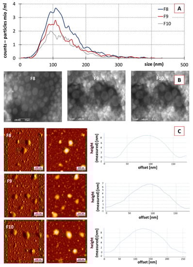 SEC resulted in a reduced particle concentration. F8 showed a particle concentration of 3.8 × 1010 particle/mL, followed by F9 and F10 with values of 5.2 × 109 and 4.1 × 109, respectively (Figure 4A). ZP values of the purified fractions were similar to the crude PEVs, with values being −37 ± 0.3, −35 ± 0.1 and −32 ± 0.08 mV for F8, F9 and F10, respectively. Hence, the purified PEVs can also be considered to possess excellent physical stability due to electro-static stabilization [30,58]. SEM and AFM analysis also confirmed the presence of the PEVs in F8, F9 and F10, with similar properties when compared to the crude PEVs (Figure 4B,C). Data, therefore, demonstrate that it was possible to obtain PEVs from cucumber via classical isolation and purification procedures, i.e., DUC and SEC. The cucumber-derived PEVs possess similar properties as those that were already reported for other PEVs.