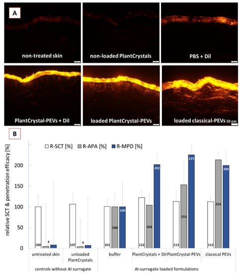Moreover, data can also provide an indirect proof that HPH is able to form PEVs in which the AI-surrogate is encapsulated. The data, therefore, support our theory and substantiate the findings from the ZP measurements. Moreover, the SCT measurements indicate that the improvement in penetration efficacy was due to the encapsulation of the DiI in PEVs and was not related to differences in the skin hydration. Skin hydration is known to promote the dermal penetration. The PlantCrystals to which the AI-surrogate was added after HPH caused a significant increase in SCT by about 22% (Figure 6B). This resulted in an increased MPD for the AI surrogate but caused no increase in APA. The application of loaded classical PEVs and loaded PlantCrystal-PEVs caused an increase in SCT by about 13%. The increase in SCT was significant when compared to the SCT, where DiI was applied in buffer. However, it was not significantly different to the SCT after application of the PlantCrystals to which DiI was added after the HPH. Hence, the hydration of the SC was similar for all formulations that contained DiI and cucumber; thus, the hydration of the SC cannot be considered to cause the different APA values. Consequently, PEVs can be considered to be the cause for the improved APA values. By considering a 2-fold increase in APA for the classical PEVs, a 1.5-fold increase in APA for the PlantCrystal-PEVs and no increase for the PlantCrystals to which DiI was added after HPH, it can be speculated that about 100% of the AI-surrogate was encapsulated in the classical PEVs and about 50% of the AI-surrogate seemed to be encapsulated in the PlantCrystal-PEVs. In contrast, no encapsulation of the AI-surrogate was expected for the PlantCrystals, to which DiI was added after HPH.
