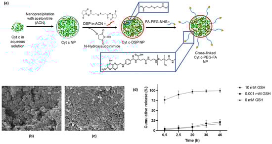 (a) Synthesis route of crosslinked Cyt c–PEG–FA NPs. SEM micrographs of (b) crosslinked Cyt c NPs and (c) crosslinked Cyt c–PEG–FA NPs. (d) Cumulative in vitro release profile of Cyt c from crosslinked Cyt c–PEG–FA NPs at 37 °C. NPs were dissolved in PBS buffer with zero GSH (triangles), 0.001 mM GSH (squares), and 10 mM GSH (circles) to simulate extracellular (non-reducing) and intracellular (reducing) physiological conditions. Data are the mean ± SD of experiments performed in triplicate. Statistical analysis by ordinary one-way ANOVA multiple comparison analysis demonstrated a significant difference between the intracellular and extracellular conditions when compared with the control, p < 0.0001.