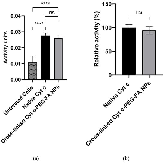 We determined the potential of Cyt c to interact with Apaf-1 and induce apoptosis after the NP formulation. For this purpose, in vitro cell-free caspase 3/7 activity assays were conducted in a cell-free system (LLC lysate), and native Cyt c was used as a positive control. As shown in Figure 2, the addition of crosslinked Cyt c–PEG–FA NPs to fresh cytosol produced caspase 3/7 activation. Compared to the untreated cells, activation of caspase 3/7 was statistically significantly higher in cells treated with the crosslinked Cyt c–PEG–FA NPs at a p-value of <0.05 (Figure 2a). Cyt c–PEG–FA NPs had 94 ± 8% of their caspase activation activity with no significant difference compared to native Cyt c (Figure 2b). Therefore, since our NPs retained all of their enzyme activity, we demonstrated that the conjugation of the Cyt c NPs does not produce any adverse impact on the capability of the protein to induce apoptosis.