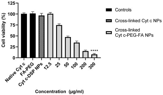 The cytotoxicity evaluation of crosslinked Cyt c–PEG–FA NPs was performed using an MTS assay. A dose-response graph was constructed upon incubation of FR-positive LLC cells at different concentrations (12.5, 25, 50, 100, 200, and 300 µg/mL) of crosslinked Cyt c–PEG–FA NPs for 24 h. As shown in Figure 3, crosslinked Cyt c–PEG–FA NPs induced a significant reduction in the LLC cell viability in a dose-dependent manner after 24 h of incubation compared to untreated cells. The calculated IC50 value of the crosslinked Cyt c–PEG–FA NPs was 47.5 µg/mL (R2 = 0.9681). Additionally, the cell viability decreased at increasing concentrations of our NPs. These results demonstrate a clear correlation between the dose concentration of the NPs and its cytotoxic effect. As controls, LLC cells were incubated with native Cyt c, FA–PEG, and Cyt c–DSP NPs (folate-free, the crosslinker alone) at the highest NP concentration (300 µg/mL), as in the corresponding experiment, for 24 h. No significant cytotoxicity was observed after 24 h with either control compound. For the native Cyt c control, it was expected not to significantly affect the cell viability, since Cyt c is a cell-membrane-impermeable protein. As hypothesized, under the same conditions, folate-conjugated Cyt c NPs significantly reduced the cell viability of folate-receptor-expressing LLC cells compared to the folate-free Cyt c NPs (**** p < 0.0001, n = 9). These results validated the hypothesis that folate-conjugation was required for our NPs to address targetability and induce a cytotoxic potential.