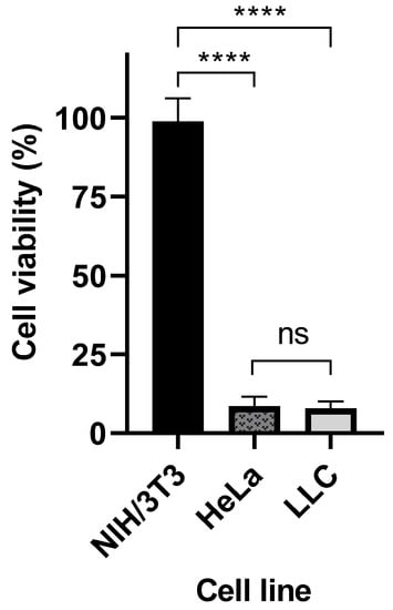 To evaluate the selective cytotoxic effect of crosslinked Cyt c–PEG–FA NPs for FR-positive cancer cells, we performed a comparative cell viability study with both FR-positive cells (the human cervical carcinoma HeLa cell line and LLC) and FR-negative cells (the mouse embryo fibroblasts NIH-3T3 cell line) [37,38]. As seen in Figure 4, crosslinked Cyt c–PEG–FA NPs significantly reduced the cell viability in FR-positive cell lines (LLC and HeLa cells) without a statistically significant difference (p < 0.05, n = 9). Furthermore, the viability of the NIH/3T3 cells was not significantly affected after 24 h of incubation with the folate-conjugated NPs. These results confirm that our FR-targeted DDS had a significant cytotoxic effect on cancer cells overexpressing FR but not on FR-negative, non-cancerous cells.