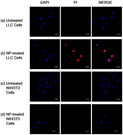 LLC cells and NIH/3T3 cells (10,000 cells/well) were seeded on 4-well chambered cover glass plates. The cells were treated with 100 μg/mL of cross-liked Cyt c–PEG–FA NPs at 37 °C for 24 h. To detect apoptosis and nuclear fragmentation in cells, these were washed with PBS (1×) and incubated with the apoptotic cell marker propidium iodide (75 μM) for 5 min. Cells were fixed with 3.7% formaldehyde and incubated with DAPI nuclear stain, followed by three cycles of PBS washing. As a mounting medium, 90% glycerol in PBS was used. The chambered cover glass plates were examined under a Nikon Eclipse Ti-E inverted confocal scanning microscope (Nikon Instruments Inc., Melville, NY, USA) using a 40× oil immersion objective. Untreated cells were subjected to DAPI/PI incubation and used as a control.