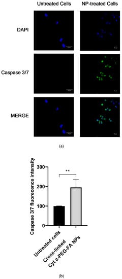 Cyt c-mediated apoptosis of a cell involves the activation of caspase 3/7. Exposure of LLC cells to NPs for 24 h presented a green fluorescence signal induced by the generated caspase 3/7 activity, while the untreated control cells showed a significantly lower fluorescence signal, as was observed by confocal imaging (Figure 6a). A quantitative analysis of these images (in the 488 nm Ex. channel shown in green) revealed a significant difference (** p = 0.003) between non-treated and NP-treated LLC cells (Figure 6b). These results are consistent with the cell-free caspase assay results described in Figure 2, indicating that the crosslinked Cyt c–PEG–FA NPs can substantially increase the apoptosis cell death by cellular events and molecular pathways of caspase regulation.