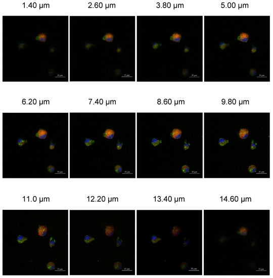 To investigate the FR-mediated endocytosis mechanism and endosomal escape capability of the crosslinked Cyt c–PEG–FA NPs, FR-positive LLC cells were incubated with FITC-labeled crosslinked Cyt c–PEG–FA NPs and the endosome marker FM-464 for 24 h. The fluorescence intensity of FITC-labeled NPs in LLC cells was observed by Z-stack confocal laser scanning microscopy. The confocal Z-stack images obtained from the endosome marker channel showed red fluorescence, while the images of nuclei stained by the DAPI showed blue fluorescence. The green fluorescence observed in the confocal Z-stack images is caused by the internalization of the FITC-labeled crosslinked Cyt c–PEG–FA NPs (Figure 7). The yellow fluorescence is due to the colocalization of the two dyes and shows NP entrapment in endosomes [39]. The confocal Z-stack images reveal that FITC-labeled NPs were found in the cytoplasm after 24 h. Furthermore, some of the FITC-labeled NPs were still entrapped in endosomes (yellow spots), agreeing with the expected uptake by endocytosis. These results confirm the potential of the crosslinked Cyt c–PEG–FA NPs for tumor-targeted drug delivery.
