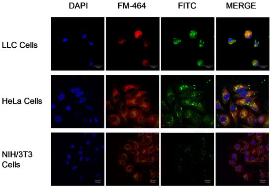 Because our NPs were smaller than 500 nm and had an FA ligand attached to their surfaces, they could be internalized through receptor-mediated clathrin-enabled endocytosis [53]. This internalization mechanism is initiated after a specific ligand-encased nanomaterial binds to a receptor on the surface of the cell membrane. After 24 h of LLC cell incubation with our FITC-labeled crosslinked Cyt c–PEG–FA NPs, the amphiphilic dye FM 464 was used as our endosome marker to confirm the uptake of our NPs in FR-positive cells. Our Z-stack confocal microscopy results showed a colocalization of FM 464, with our fluorescently labeled NPs showing a successful uptake.