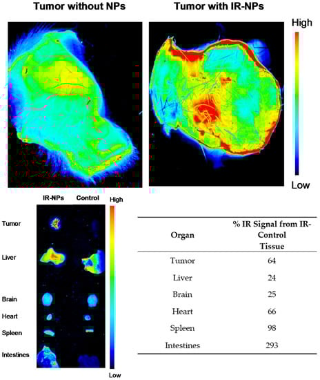 Mouse tumors were grown up to 15 d after implant. These mice were injected by tail vein route with infrared-labeled NPs (IRDye 680RD-labeled NPs) to visualize these. An amount of 0.15 mg of NPs was administered in a volume of 200 μL, following the protocol of Barcelo-Bovea et al. (2020) [30]. Five minutes after tail vein injection, mice were subsequently euthanized. Tumor and organs (brain, heart, lungs, spleen, kidneys, liver, and intestines) were quickly extracted and scanned for IR-labeled NP distribution using the LI-COR Odyssey CLx infrared scanner. For the tumors, a 42 μm resolution and high-quality setting were chosen in Image StudioTM software (Lincoln, NE, USA). For the organs, a 337 μm resolution was used. All the scanned tissue area in the 2-dimensional image was selected for quantification, and the IR signal was scanned and analyzed using Image StudioTM. The percentage increase in infrared signal from the control mouse at 5 min after tail vein injection was calculated following Barcelo-Bovea et al. (2020).
