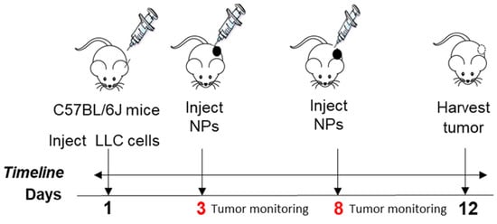 To test tumor and organ targeting by NPs after entering the blood circulation, we used a syngeneic (immune-competent) C57BL6J mouse model called Lewis lung carcinoma (LLC). We used 14-week-old mice (C57BL6J wild type strain, male, from Jackson Labs, Bar Harbor, ME, USA) of 25 g in weight. To develop the Lewis lung carcinoma in these mice, we first grew the LLC murine lung carcinoma cells (commercially obtained, derived from a C57BL6J mouse lung tumor) in a flask, and, after confluency, cells were quantified and injected subcutaneously. LLC mouse cancer cells were cultured in high-glucose Dulbecco’s modified Eagle’s medium (DMEM) supplemented with 10% fetal bovine serum (FBS) and 1% penicillin/streptomycin/amphotericin (PSA) to confluency. Cells were gently removed from the culture flask using a cell scraper, centrifuged at 1500× g (5 min), and quantified. After quantification, 1 × 107 LLC cells were obtained and added to a 1.5 mL tube to a total volume of 200 μL with cell media. This 200 μL of 1 × 107 cells was added to 200 μL of extracellular matrix (ECM) growth factor reduced gel from Engelbreth-Holm-Swarm murine sarcoma (Sigma-Aldrich, St. Louis, MO, USA), and they were gently mixed by pipetting. This total of 400 μL cells plus ECM was subcutaneously injected into the upper-right dorsal area of the mouse body using a 26 gauge needle to induce tumor growth.
