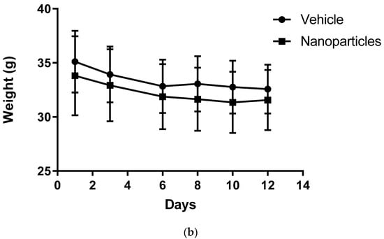 A total of n = 6 mice were untreated, and n = 7 mice were treated with NPs. An unpaired t-test with a Kolmogorov–Smirnov analysis by GraphPad Prism between NP-treated and untreated mice was considered statistically significant within the 95% confidence interval at p = 0.0385. Animal weight was also measured to monitor drug safety, as a sharp decrease in body weight (more than 15–20% during the experiment) is considered unhealthy in tumor models [35]. No difference in mouse weight between groups was observed.