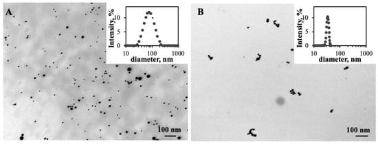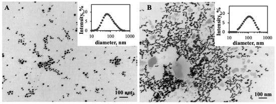 TEM images (Figure 1) present the ChAuNPs and CystAuNPs formulated. A polydisperse ChAuNPs suspension was synthesized through the reduction in gold salt by chitosan presenting a spherical shape (Figure 1A). These results corroborate intensity distribution graph and size analyzed by DLS measurements (Table 1). CystAuNPs were prepared by the functionalization with cysteamine of gold nanoparticles synthesized by the Turkevitch method [33]. CystAuNPs (Figure 1B) have mainly spherical shapes.