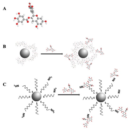 (A) Chemical structure of EGCG; (B) Scheme of nanoconjugate EGCG-ChAuNPs; (C) Scheme of nanoconjugate EGCG-CystAuNPs.
