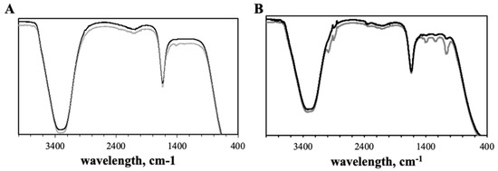 (A) FTIR spectra of ChAuNPs (grey line) and EGCG-ChAuNPs (black line). (B) FTIR spectra of CystAuNPs (grey line) and EGCG-CystAuNPs (black line). The spectra were shifted for a better visualization.