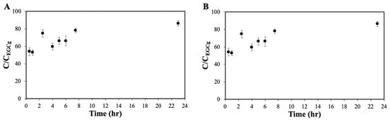 In fact, after 30 min, 54% of EGCG was released from EGC-ChAuNPs nanoconjugates (Figure 5A). In 8 h, 52% of the EGCG was released from EGCG-CystAuNPs (Figure 5B). Comparing both nanoconjugates, after 24 h of incubation, 86.2% and 60.9% of the EGCG was released from ChAuNPs and CystAuNPs, respectively. These data correspond to 0.038 and 0.041 mM of EGCG concentration in CystAuNPs and ChAuNPs suspensions, respectively. The complete amount of catechin was achieved after 48 h.