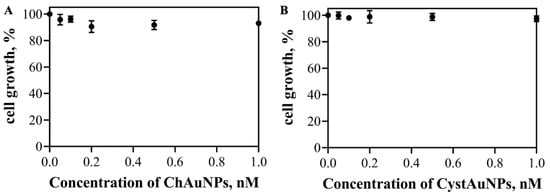 The cytotoxicity of ChAuNPs and CystAuNPs to BxPC3 cells was evaluated by the SRB method. Figure 6 displays the cell growth results of the cancer cells after 24 h of incubation with the nanoparticles alone. Figure 5 shows that, for concentrations up to 1 nM, CystAuNPs do not have effect on the cell growth of BxPC3 cells. For ChAuNPs, concentrations up to 2 nM the same effect was verified. For concentrations above 0.2 nM until 1 nM, ChAuNPs present 10% of toxicity on this type of cancer cells.