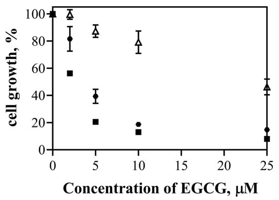 Effect of free EGCG (Δ), EGCG-AuChNPs (■) and EGCG-CysAuNPs (⬣) on the growth of pancreatic cancer (BxPC3 cells).