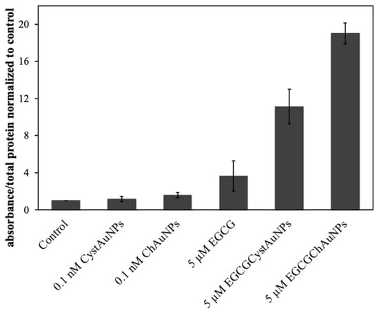 A total of 2.0 mL ChAuNPs were then conjugated with 1.0 mL of 0.27 mM EGCG via carbodiimide-mediated cross-linking (EDC/NHSS) with a molar ratio EGCG: EDC/NHSS of 1:0.5, at room temperature (RT) for one hour. The final solution was centrifuged at 12,000 rpm during 8 min to remove the excess of EGCG. The concentration of the EGCG-ChAuNPs was 14.5 nM (Lambert–Beer Law, Figure S1A).