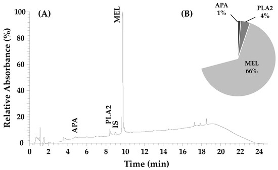(A) Chromatographic profile of Apis mellifera iberiensis venom at 220 nm; (B) quantification of the main compounds of the honeybee venom; APA—apamim; PLA2—phospholipase A2; IS—internal standard (cytochrome c, 25 µg/mL); MEL—melittin.
