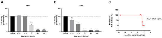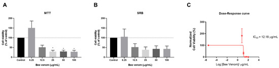 Cell viability of MCF-7 breast cancer cells treated with honeybee venom. (A) MTT assay, (B) SRB assay and (C) the dose–response curve of MCF-7 cells cultured in 96-well plates and treated with increasing concentrations (6.25–100 µg/mL) of honeybee venom for 48 h. The dose–response curve was obtained by non-linear regression after normalization of cell viability values. Each point represents the mean ± SEM relative to the control cells (0.1% DMSO) of three independent experiences. * Statistically significant vs. control at p < 0.05.