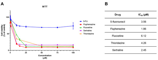 Cytotoxic effect of 5-FU and CNS drugs in HT-29 colon cancer cells. (A) MTT results of HT-29 cells treated with increasing concentrations of 5-FU and four different CNS drugs. HT-29 cells were cultured in 96-well plates and treated with increasing concentrations (0.1–100 µM) of each drug for 48 h. (B) IC50 values obtained for 5-FU and CNS drugs in HT-29 cells. These values were obtained by plotting dose–response curves for each drug using non-linear regression after normalization of cell viability values. Each point represents the mean ± SEM relative to the control cells (0.1% DMSO) of three independent experiences.