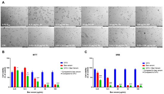 MTT results demonstrated that honeybee venom in concentrations above 25 µg/mL had greater anti-cancer potential than 5-FU (at the concentration of its IC50). Regarding the combination of honeybee venom with 5-FU, these results demonstrated an improved cytotoxic effect compared to single treatments with bee venom for concentrations ranging from 6.25 to 25 µg/mL. Particularly, for the combined pairs of 5-FU + 12.5 µg/mL of bee venom and 5-FU + 25 µg/mL of bee venom, results were even better than both 5-FU and bee venom alone (Figure 4B). The results of the SRB assay demonstrated that cellular protein content was significantly reduced when 5-FU was combined with 6.25 and 12.5 µg/mL of honeybee venom, compared to 5-FU and bee venom alone for the same concentrations (Figure 4C). Morphological analysis also confirmed that the combination of 5-FU + bee venom was promising in decreasing the number of tumour cells, especially when comparing lower concentrations (Figure 4A).