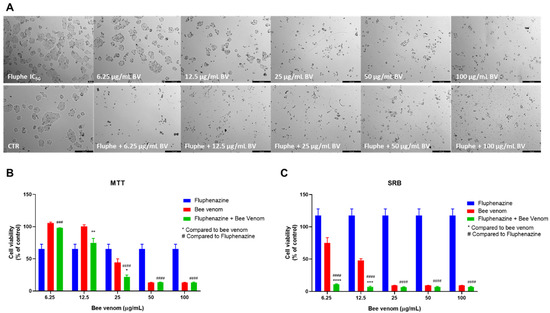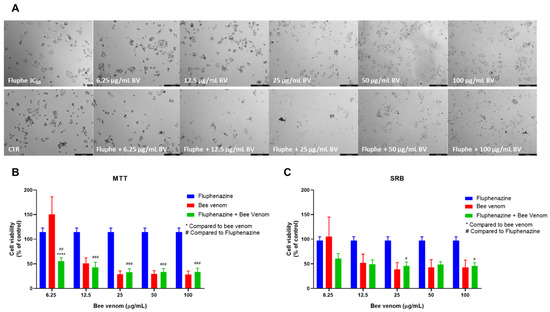 Effect of honeybee venom combined with fluphenazine in MCF-7 breast cancer cells. (A) Morphological analysis; (B) MTT and (C) SRB assays. MCF-7 cells were cultured in 96-well plates and treated with each combination for 48 h. Cell viabilities were determined after the final treatment. Each point represents the mean ± SEM relative to the control cells (0.1% DMSO) of three independent experiences. **** Statistically significant vs. bee venom at p < 0.0001; # Statistically significant vs. fluphenazine at p < 0.05; ## Statistically significant vs. fluphenazine at p < 0.01; ### Statistically significant vs. fluphenazine at p < 0.001. Scale bar: 179.3 µm; BV: bee venom.