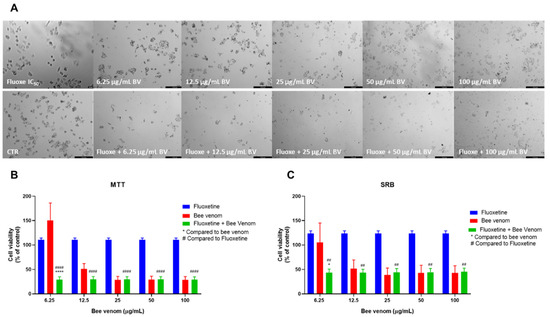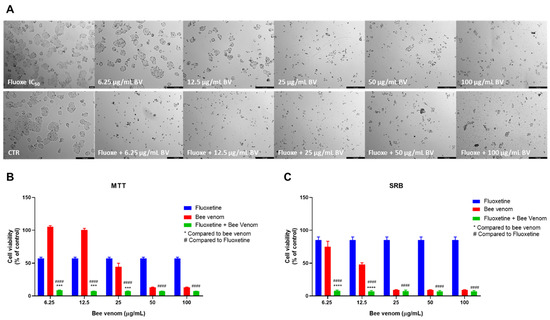 Effect of honeybee venom combined with fluoxetine in MCF-7 breast cancer cells. (A) Morphological analysis; (B) MTT and (C) SRB assays. MCF-7 cells were cultured in 96-well plates and treated with each combination for 48 h. Cell viabilities were determined after the final treatment. Each point represents the mean ± SEM relative to the control cells (0.1% DMSO) of three independent experiences. * Statistically significant vs. bee venom at p < 0.05; **** Statistically significant vs. bee venom at p < 0.0001; ## Statistically significant vs. fluoxetine at p < 0.01; #### Statistically significant vs. fluoxetine at p < 0.0001. Scale bar: 179.3 µm; BV: bee venom.