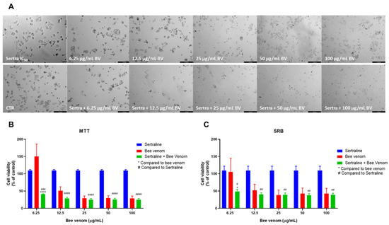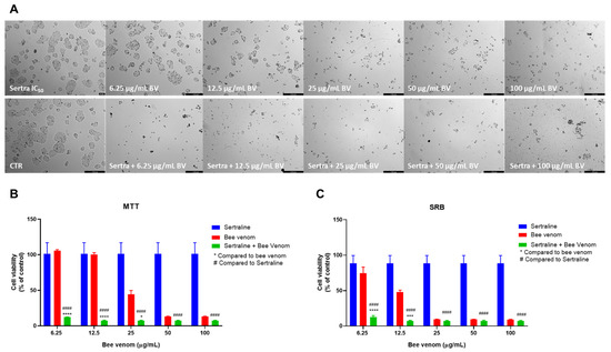 Effect of honeybee venom combined with sertraline in MCF-7 breast cancer cells. (A) Morphological analysis; (B) MTT and (C) SRB assays. MCF-7 cells were cultured in 96-well plates and treated with each combination for 48 h. Cell viabilities were determined after the final treatment. Each point represents the mean ± SEM relative to the control cells (0.1% DMSO) of three independent experiences. * Statistically significant vs. bee venom at p < 0.05; **** Statistically significant vs. bee venom at p < 0.0001; # Statistically significant vs. sertraline at p < 0.05; ## Statistically significant vs. sertraline at p < 0.01; ### Statistically significant vs. sertraline at p < 0.001; #### Statistically significant vs. sertraline at p < 0.0001. Scale bar: 179.3 µm; BV: bee venom.