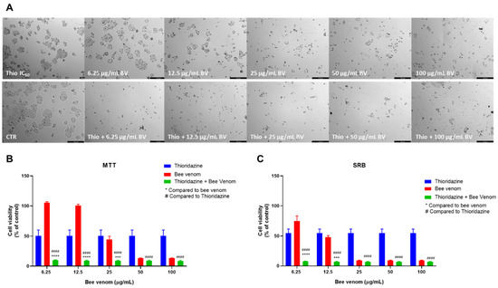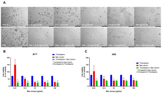 Effect of honeybee venom combined with thioridazine in MCF-7 breast cancer cells. (A) Morphological analysis; (B) MTT and (C) SRB assays. MCF-7 cells were cultured in 96-well plates and treated with each combination for 48 h. Cell viabilities were determined after the final treatment. Each point represents the mean ± SEM relative to the control cells (0.1% DMSO) of three independent experiences. ** Statistically significant vs. bee venom at p < 0.01; **** Statistically significant vs. bee venom at p < 0.0001; # Statistically significant vs. thioridazine at p < 0.05; ## Statistically significant vs. thioridazine at p < 0.01. Scale bar: 179.3 µm; BV: bee venom.