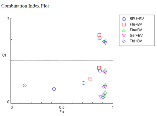 Fa-CI plot of combined treatments of 5-FU and CNS drugs combined with honeybee venom on HT-29 colon cancer cells. The combination index was calculated using CompuSyn software. CI < 1, =1, and >1 indicates synergistic, additive, and antagonistic effects, respectively. BV: bee venom; 5FU: 5-fluorouracil; Flu: fluphenazine; Fluo: fluoxetine; Ser: sertraline; Thi: thioridazine.