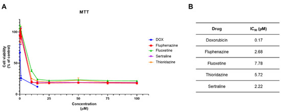 Cytotoxic effect of DOX and CNS drugs in MCF-7 breast cancer cells. (A) MTT results of MCF-7 cells treated with increasing concentrations of DOX and four different CNS drugs. MCF-7 cells were cultured in 96-well plates and treated with increasing concentrations (0.1–100 µM) of each drug for 48 h, except for DOX which was tested from 0.1–15 µM. (B) IC50 values obtained for DOX and CNS drugs in MCF-7 cells. These values were obtained by plotting dose–response curves for each drug using non-linear regression after normalization of cell viability values. Each point represents the mean ± SEM relative to the control cells (0.1% DMSO) of three independent experiences.