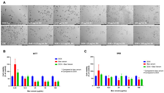 Effect of honeybee venom combined with DOX in MCF-7 breast cancer cells. (A) Morphological analysis; (B) MTT and (C) SRB assays. MCF-7 cells were cultured in 96-well plates and treated with each combination for 48 h. Cell viabilities were determined after the final treatment. Each point represents the mean ± SEM relative to the control cells (0.1% DMSO) of three independent experiences. ** Statistically significant vs. bee venom at p < 0.01; Scale bar: 179.3 µm; BV: bee venom.