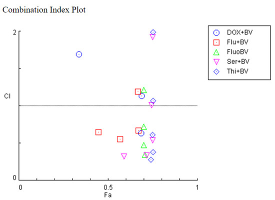 Fa-CI plot of combined treatments of DOX and CNS drugs combined with honeybee venom on MCF-7 breast cancer cells. The combination index was calculated using CompuSyn software. CI < 1, =1, and >1 indicates synergistic, additive, and antagonistic effects, respectively. BV: bee venom; DOX: doxorubicin; Flu: fluphenazine; Fluo: fluoxetine; Ser: sertraline; Thi: thioridazine.