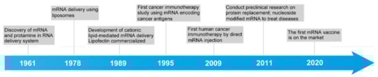An examination into mRNA vaccine development history shows that a half century passed from the discovery of mRNA to the clinical application of mRNA vaccines (Figure 1). mRNA was first conceptualized by Jacques Monod and François Jacob and then was demonstrated by Jacob, Sydney Brenner, and Matthew Meselson at California Institute of Technology in 1961. In 1978, Dimitriadis successfully transfected exogenous mRNA into mouse lymphocytes with liposomes []. In the same year, Ostro et al. transfected mRNA into human cells []. In 1984, Krieg injected biologically active mRNA, synthesized in a laboratory from promoter-containing plasmids, into frog eggs, revealing that the laboratory-made mRNA functioned similar to the endogenous one []. Malone et al. first proposed the concept of an mRNA vaccine in 1989 [], approximately the same time that the cationic lipid-mediated mRNA delivery system lipofectin was commercialized. In 1995, the first cancer immunotherapy study was performed, in which scientists attempted to inject mRNA-encoded cancer antigens into the body to train the immune system to attack cancer cells [], and this technique was first applied to humans in 2009 []. In 2011, transcription activator-like effector nuclease (TALEN) technology was developed for use in gene editing [], providing powerful tools for mRNA engineering. Moreover, the outbreak of SARS-COV-2 since 2019 accelerated the development of mRNA vaccines. On 11 December 2020, the Pfizer-BioNTech vaccine BNT162b2 received emergency authorization from the FDA and became the first mRNA drug approved for use in humans [].