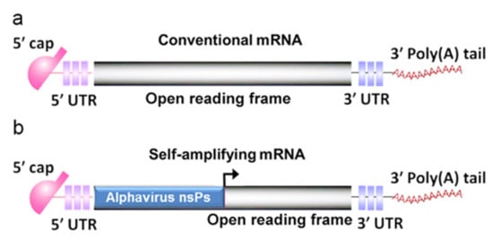 Compared with conventional mRNA, saRNA is larger, with 9000–12,000 nucleotides, since an additional alphavirus-derived coding sequence is included; this ORF encodes four nonstructural proteins (nsPs), which can converge to form RNA replicases [], driving the amplification of the mRNA-encoded antigen []. Compared with the conventional mRNA vaccine, the saRNA vaccine can induce more effective and durable antigen protein expression, which addresses the transient expression that limits conventional mRNA therapeutics []. By comparing the capacities of different vaccines to protect mice against influenza, Vogel et al. demonstrated that a saRNA vaccine shows efficiency equivalent efficiency to that of mRNA vaccines but at a much lower dose, indicating that saRNA is a promising platform for future vaccines [].