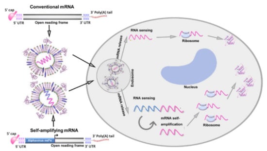 Conventional mRNA has a relatively small size, with 1000–5000 nucleotides [], which leads to easier and more effective mRNA encapsulation. Liang et al. demonstrated that a conventional mRNA-based vaccine can effectively induce both innate immunity and adaptive responses []. However, nonreplicating mRNA leads to only transient protein expression, and therefore, to achieve effective therapeutic effects, a higher dose of vaccine is required [].
