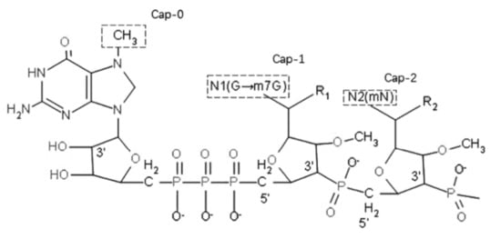 The structure of the 5′-cap (cited from []). The first nucleoside in the 5′-cap is usually composed of a guanine methylated at the seventh position and a ribosome (m7G). m7G is connected to the terminal nucleotide of the mRNA through a phosphate bond. The following first or second nucleotide can also be methylated at the 2′ hydroxyl group of the ribose. Type O (m7G5′ppp5′Np) has an unmethylated ribose; type I (m7G5′ppp5′NmpNp) has a methylated ribose in the first nucleotide at the terminus; and in type II (m7G5′ppp5′NmpNmp), both nucleotides are methylated.