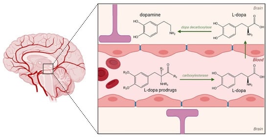 Bioconversion of levodopa (L-DOPA) prodrug to L-DOPA by enzyme carboxylesterases in the blood (case of XP21279). L-DOPA then passes through the blood-brain barrier (BBB) and permeates into the brain where it is converted to dopamine via DOPA decarboxylase. Created using BioRender.com (Accessed on 2 January 2022).