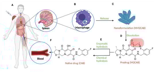 Mechanism for in vivo activity of LASER ART. (A) Intramuscular injection of cabotegravir prodrug nanoformulation (NM2CAB). (B) Lymphoid organs such as spleen act as secondary depots for the nanoformulation with internalization of NM2CAB by splenic macrophages. (C) The nanoformulation is slowly released from the macrophages and enters the extracellular matrix. (D) Dissolution of the nanocrystals provides free prodrug M2CAB. (E) Enzymatic hydrolysis and alkaline pH release the promoiety from the native drug. (F) The pharmacologically active native drug (CAB) enters the systemic circulation and elicits its activity as a potent integrase inhibitor. Created using BioRender.com (Accessed on 2 January 2022).