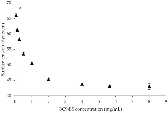 Beyond being natural compounds, biosurfactants (BS) are amphiphilic molecules, thus their potential applications rely on the ability to reduce surface and interfacial tension [10,12,25]. In the present study, surface-activity of BC9-BS, CAPB and TPGS was evaluated at room temperature (25 °C) and at pH 5.5 by means of a phosphate buffer used to mimic the nasal pH, which ranges from 5.5 to 6.5 in adults and from 5.0 to 6.7 in children [26]. Figure 1, which shows the surface tension plotted as a function of surfactant concentration, confirmed that all tested compounds exhibit surface-active properties. Moreover, for each of them it was possible to calculate the CMC, known as the concentration that enables the lowest stable surface tension to be reached, and after which surfactants self-assemble in micelles [9,10].
