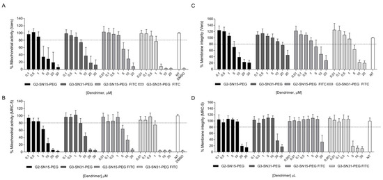 Results obtained from the MTT assay (Figure 1A,B) were more restrictive than those obtained from the LDH assay (Figure 1C,D), therefore we considered those results for the determination of the working concentrations. Non-toxic concentrations of the dendrimers for both cell lines are as follows: 1 µM, 1 µM, 1 µM and 0.5 µM for G2-SN15-PEG, G3-SN31-PEG, G2-SN15-PEG FITC and G3-SN31-PEG FITC, respectively.