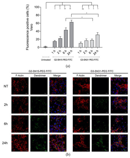 Internalization study of cationic dendrimers into Vero cells. (a) Percentage of FITC-positive cells observed by flow cytometry 1 h, 2 h, 6 h and 24 h post-treatment. Data are represented as mean ± SD of two individual experiments. (b) Representative confocal images of cells incubated with 1 µM G2-SN15-PEG FITC and 0.5 µM G3-SN31-PEG FITC dendrimers (green) for 2 h, 6 h or 24 h. Phalloidin was used to mark actin filaments (red) and DAPI for nucleus (blue). Scale bars indicate a length of 25 µm. (* p < 0.05; ** p < 0.01; ns: non-significant). DAPI: 4′,6-diamidino-2-phenylindole dihydrochloride.