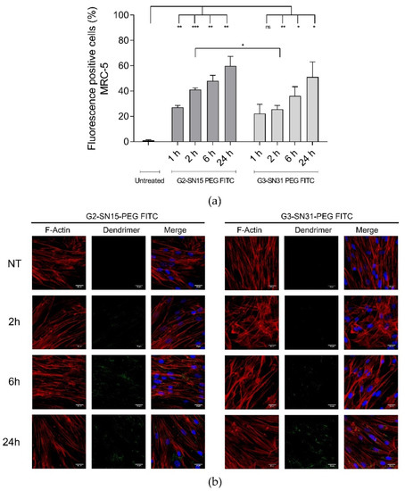 Internalization study of cationic dendrimers into MRC-5 cells. (a) Percentage of FITC-positive cells observed by flow cytometry 1 h, 2 h, 6 h and 24 h post-treatment. Data are represented as mean ± SD of two individual experiments. (b) Representative confocal images of cells incubated with 1 µM G2-SN15-PEG FITC and 0.5 µM G3-SN31-PEG FITC dendrimers (green) for 2 h, 6 h or 24 h. Phalloidin was used to mark actin filaments (red) and DAPI for nucleus (blue). Scale bars indicate a length of 25 µm. (* p < 0.05; ** p < 0.01; *** p < 0.001; ns: non-significant). DAPI: 4′,6-diamidino-2-phenylindole dihydrochloride.