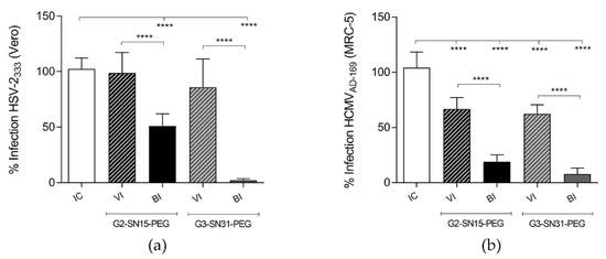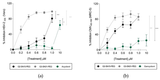 Results shown in Figure 4a,b indicate that both G2-SN15-PEG and G3-SN31-PEG dendrimers are able to inhibit HSV-2 and HCMV infections at the maximum non-toxic concentrations. In both cases, the G3-SN31-PEG dendrimer presented better inhibition results at all tested concentrations, achieving values of 99% and 86% for HSV-2 and HCMV, respectively, at the maximum non-toxic concentration. Interestingly, both dendrimers present significantly better inhibition results than the actual reference treatments Acyclovir and Ganciclovir at their maximum non-toxic concentration.