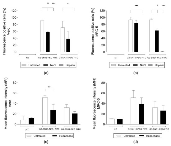 Interaction of cationic dendrimers with cell surface heparan sulphate proteoglycans (HSPGs). Fluorescent positive cells and mean fluorescence intensity of G2-SN15-PEG FITC and G3-SN31-PEG FITC dendrimers measured by flow cytometry in Vero (a,c) and MRC-5 (b,d) cells. Heparin competition assay, NaCl wash, and heparinase II treatment experiments were performed to determine the interaction of PEGylated cationic carbosilane dendrimers (PCCDs) with cell surface HSPGs. Data are represented as mean ± SD of two individual experiments * p < 0.05; ** p < 0.01; *** p < 0.001.
